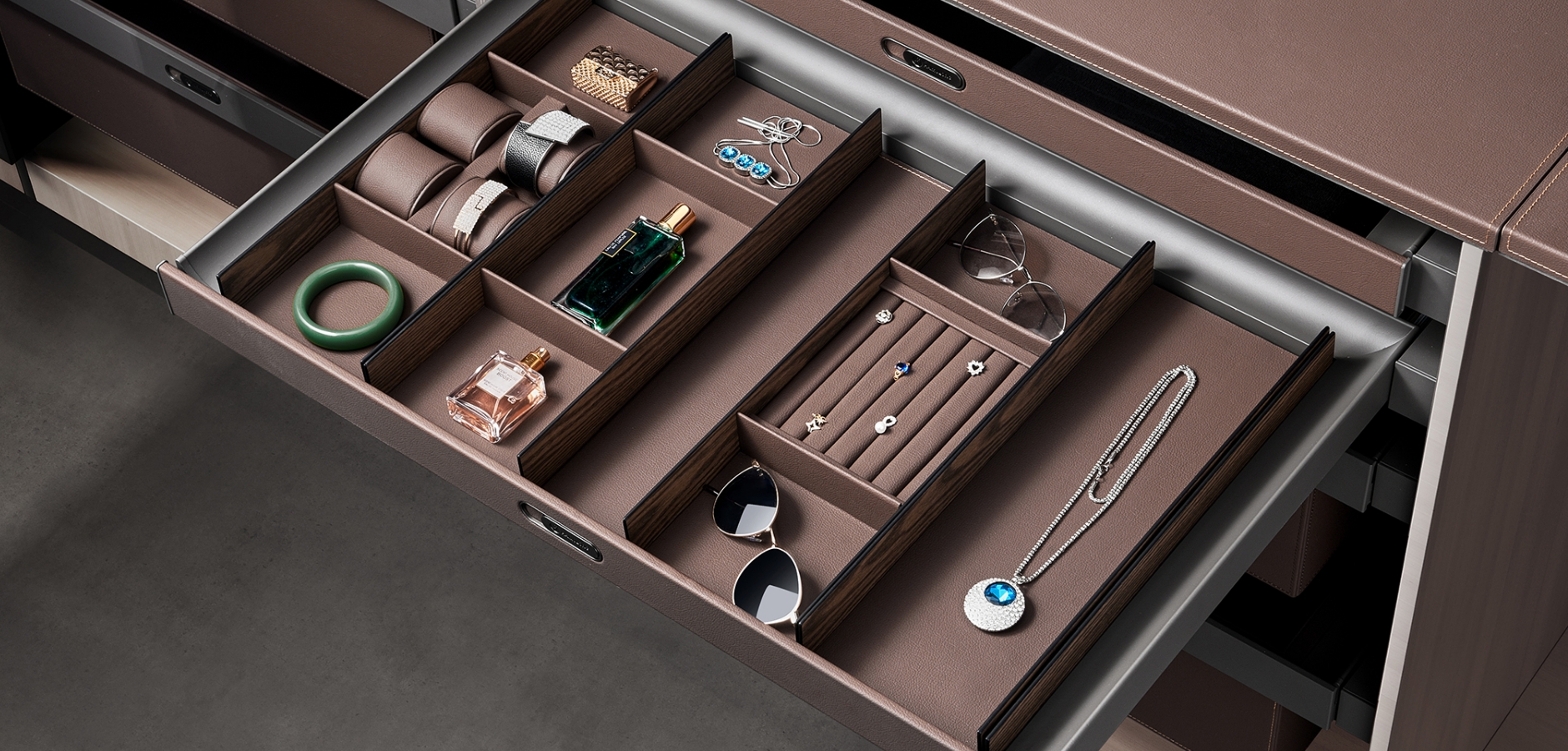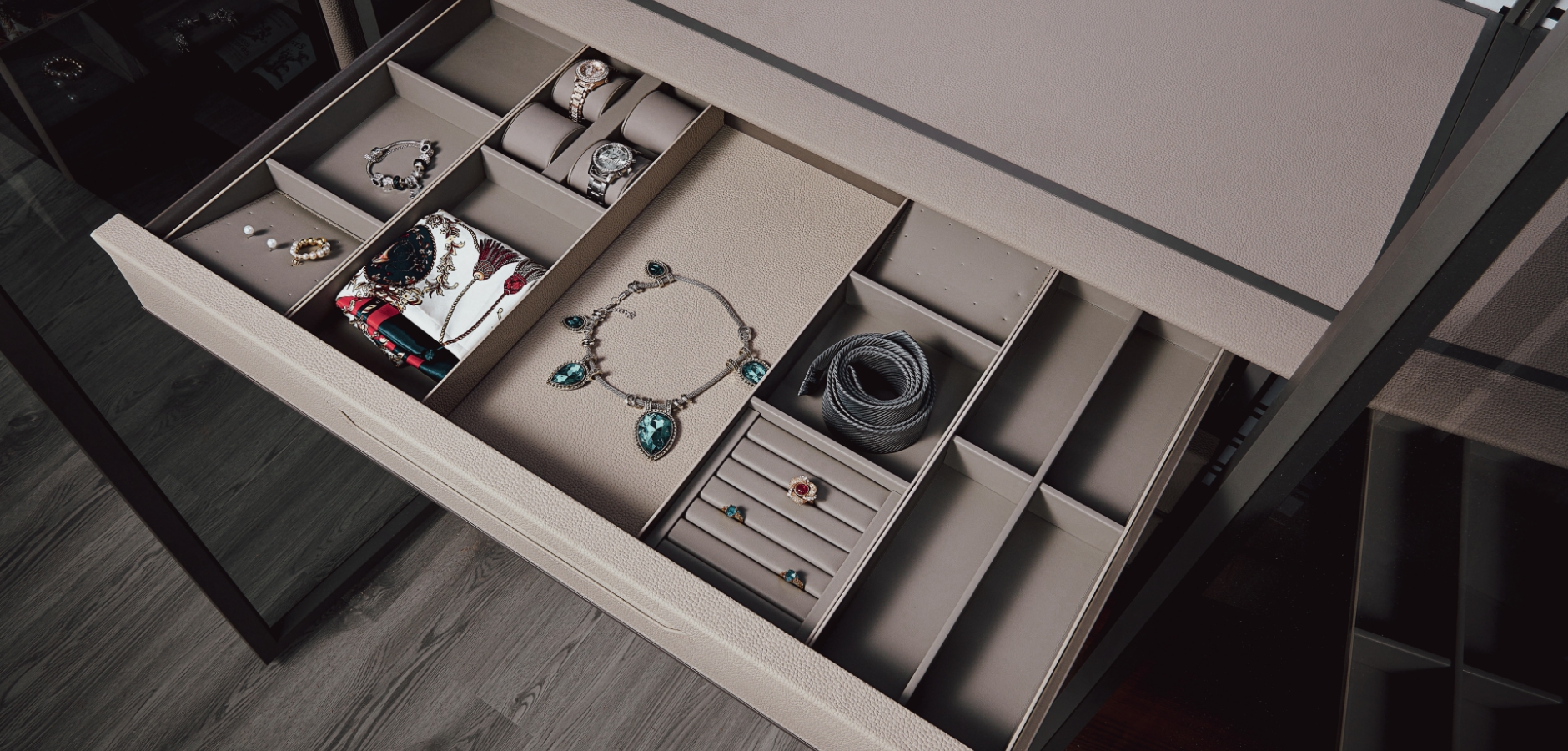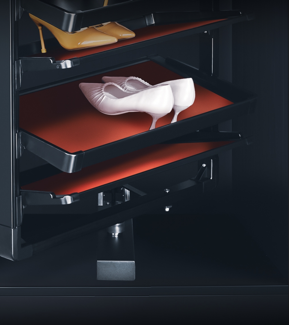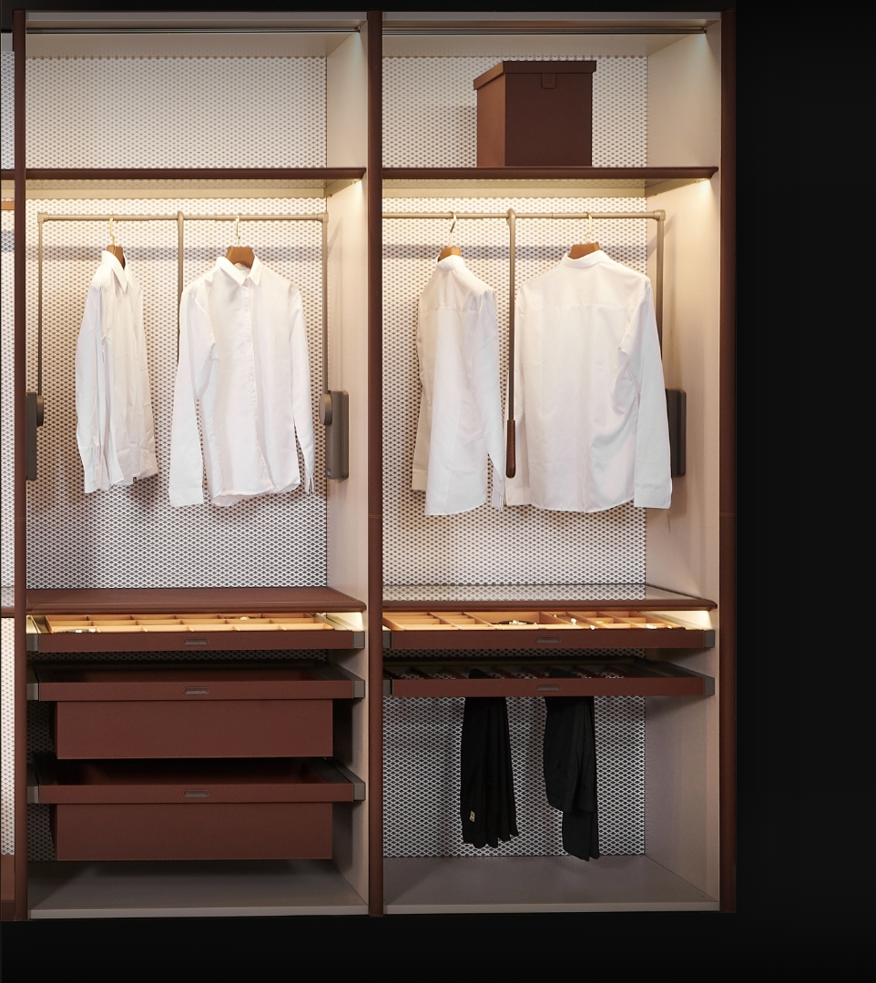 無論是襯衣、西裝、連衣裙、皮鞋或是項鍊、手錶等小物品,我們的皮革衣櫃收納系統都能為您提供一個有序且易於收取的空間。